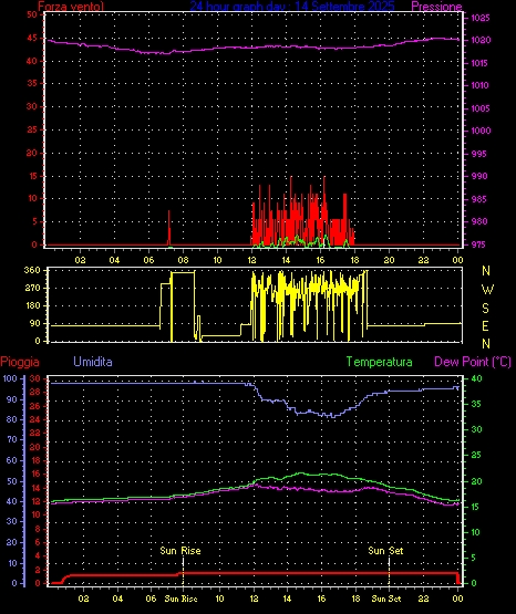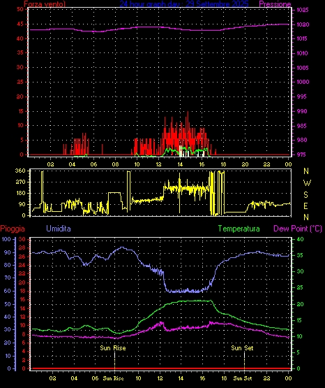 Velocità massima di raffica = 18.5 km/h da 225°( SW) giorno 02 tempo 14:08